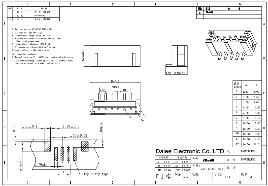 AB Type 1.5mm Pitch Single Row Type 02 to 12 Contacts Dalee Professional Wafer Connector